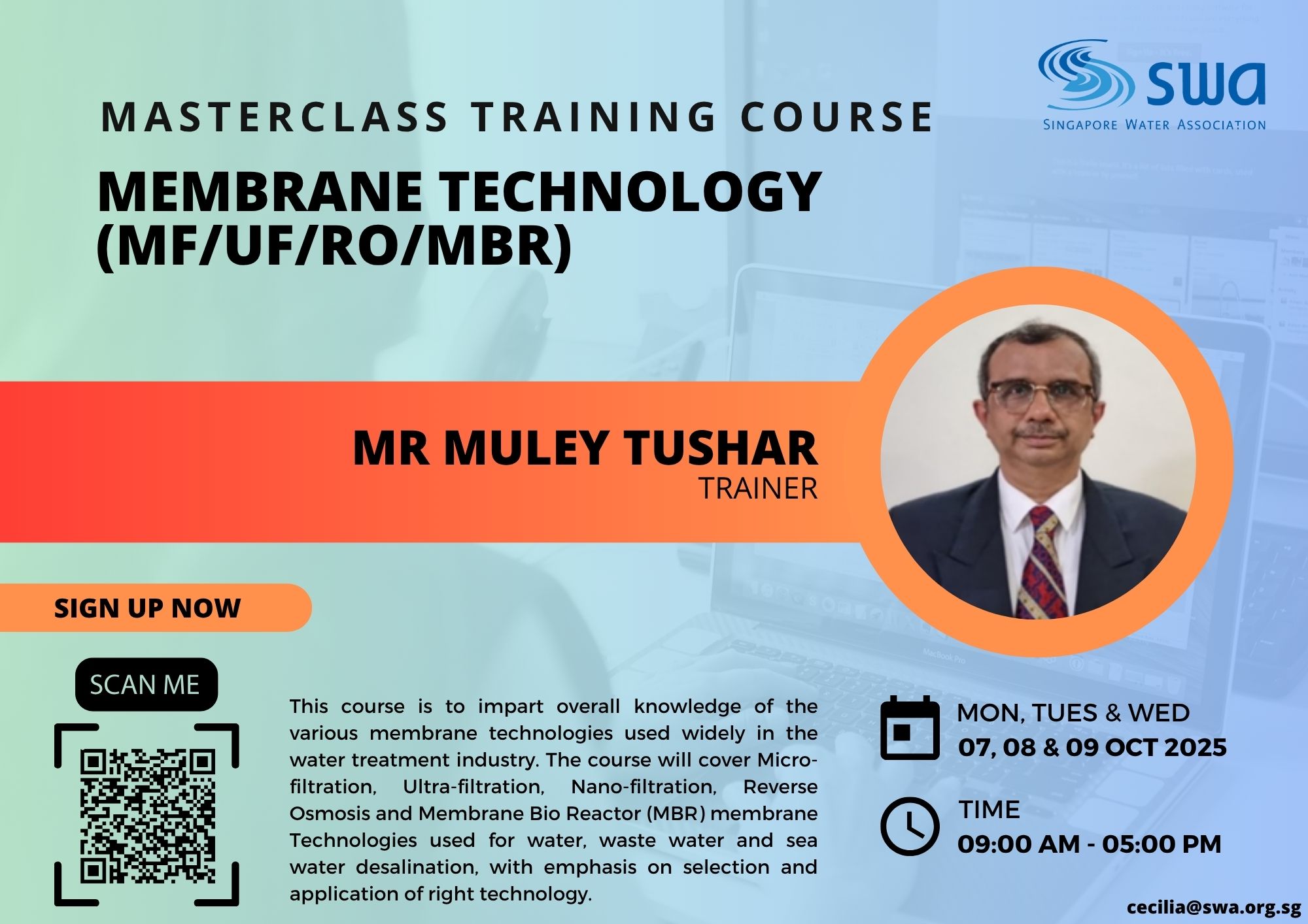 Singapore Water Association will be organising a 3-day course, Membrane Technology (MF/UF/RO/MBR) on 15th, 16th & 17th September 2025.